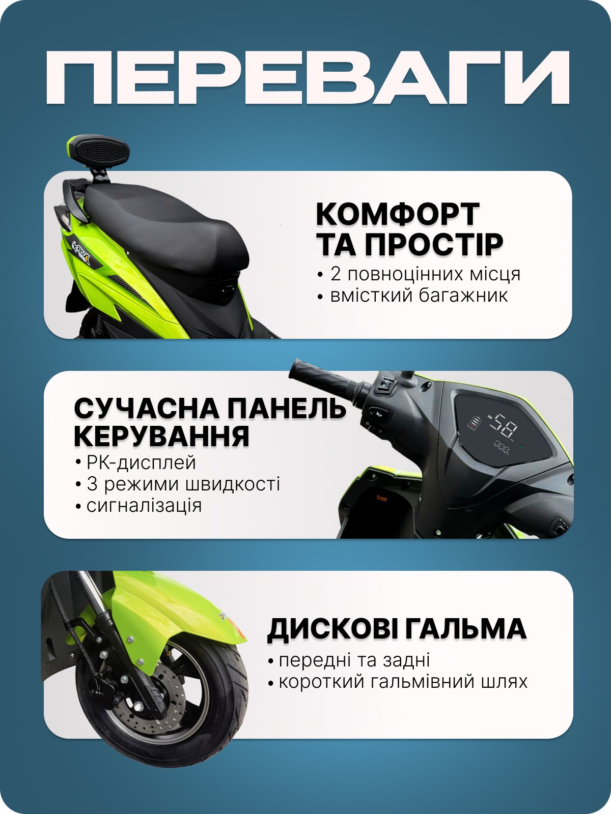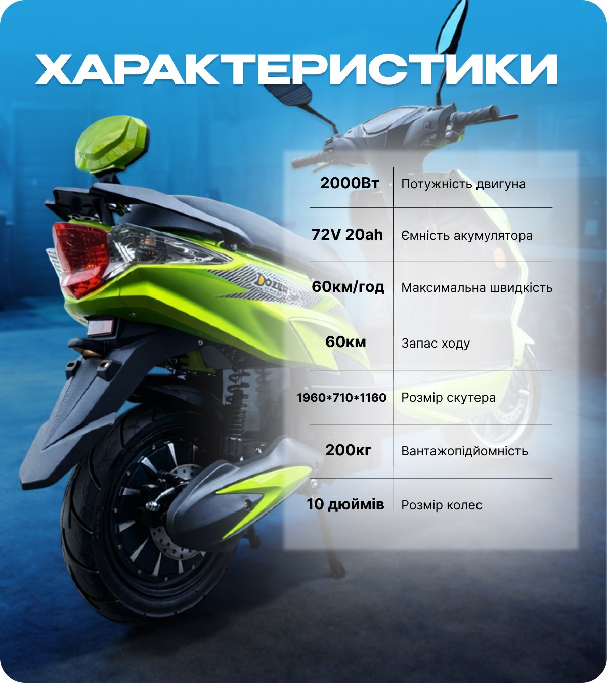 Електроcкутер DOZER S-2000 - це стильний і надійний транспорт для щоденних поїздок містом або заміськими дорогами. Оснащений потужним електродвигуном, він забезпечує максимальну швидкість 60 км/год і запас ходу до 60 км на одному заряді, що дозволяє зручно пересуватись без підзарядки протягом усього дня.